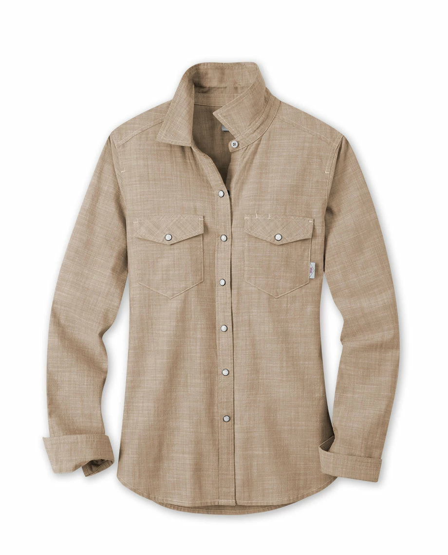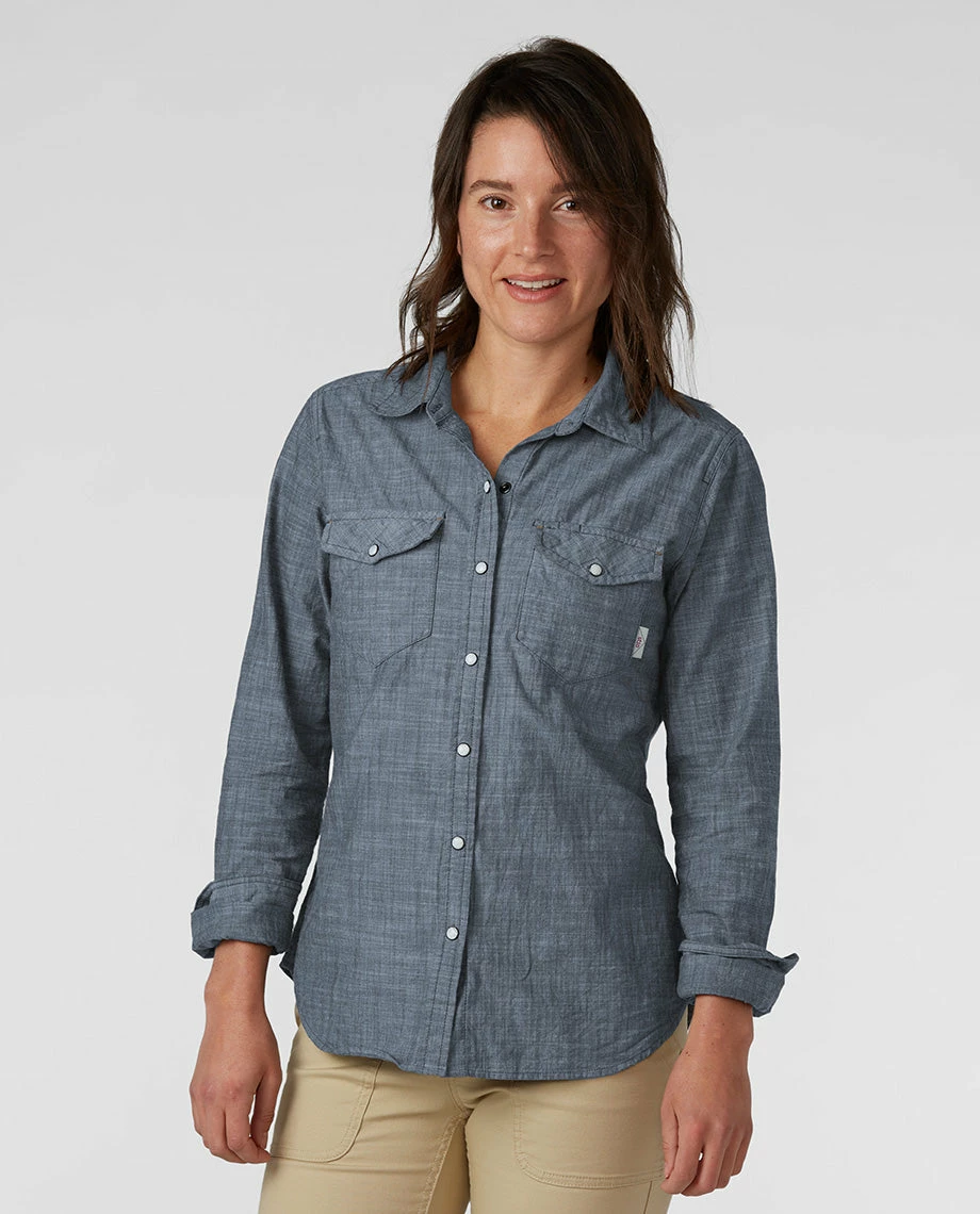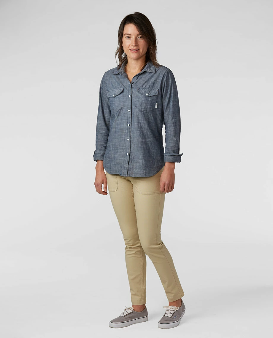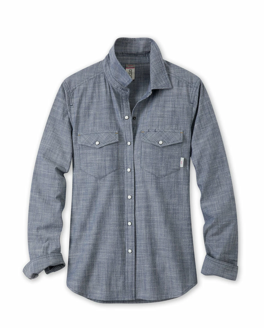 The original ethic of our hometown was founded on rugged work outside. Weโve borrowed from that lineage with our Chambray shirt, which blends the toughness inherent in the timeless woven material with a skin-side softness that stays comfortable enough for long leisurely days. Pearl snaps, pinecone buttons and classic Western detailing provides that high range identity to a piece that easily spans from work to rest to play. Adjustable placketed cuffs allow for an easy roll and a shirttail hem looks good tucked in or left out.