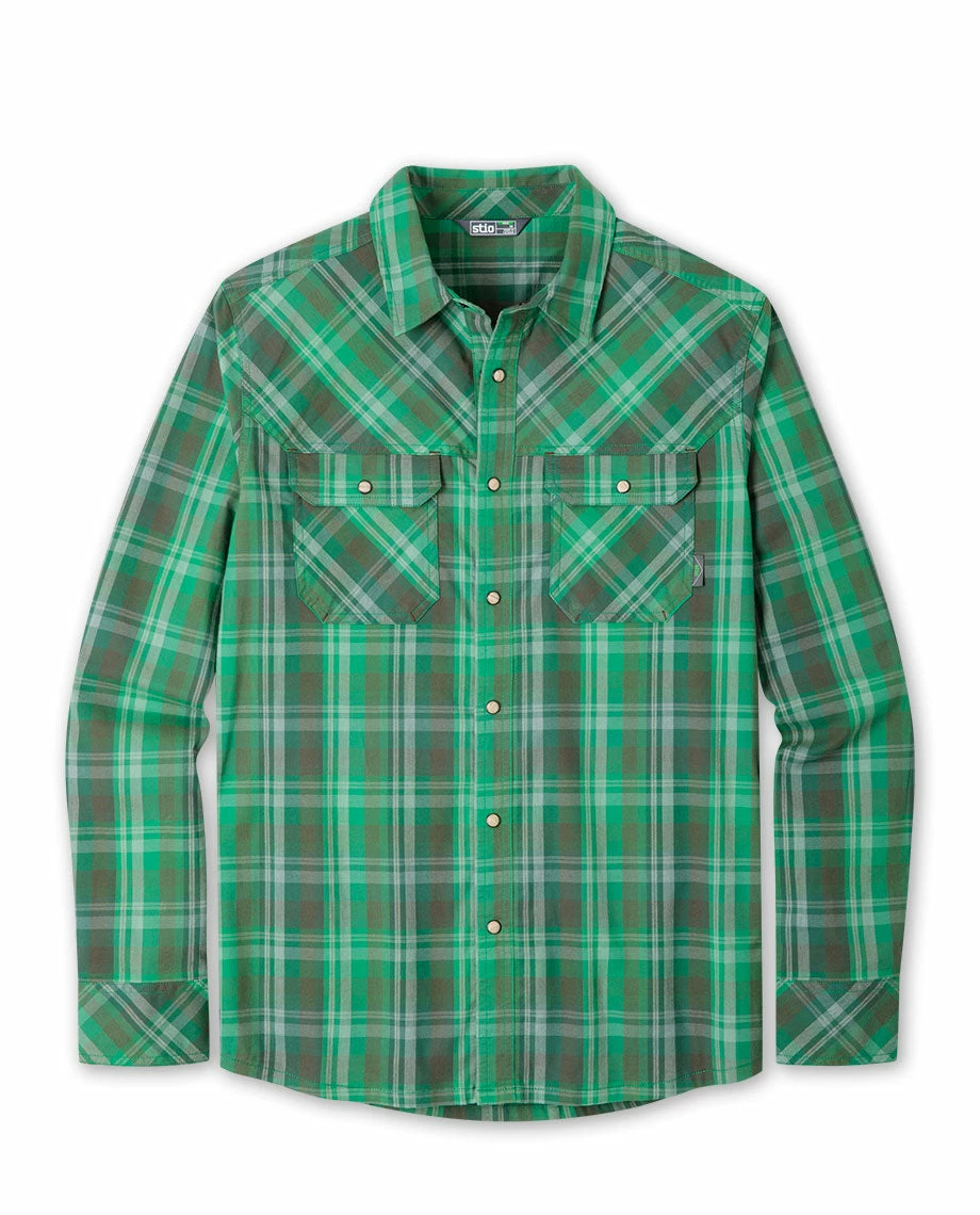 - Custom Stioยฎ logo embossed pearl snap at collar stand