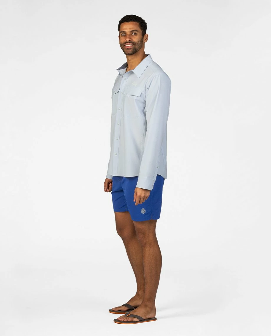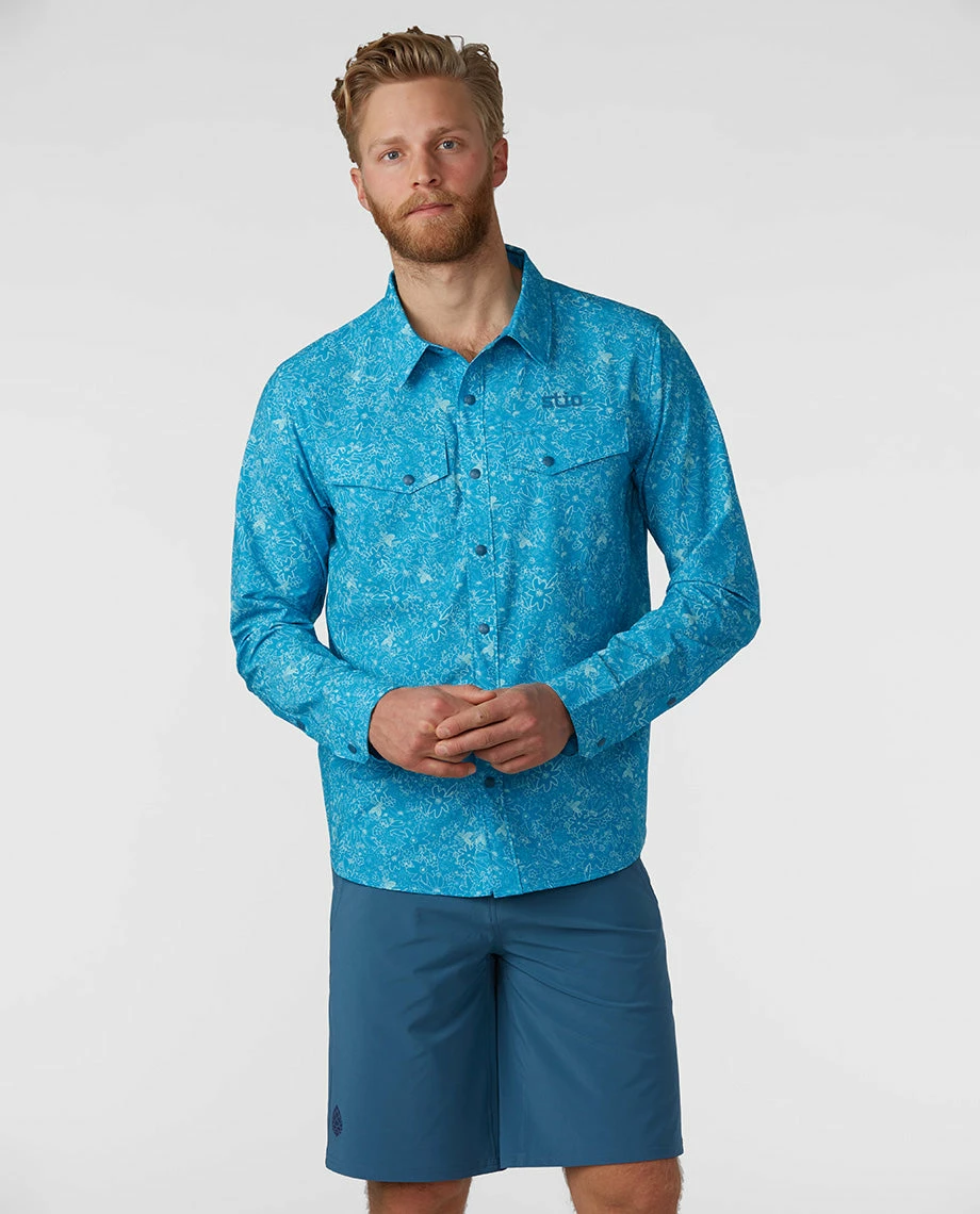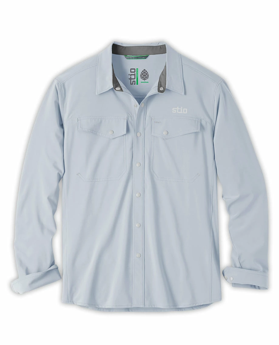 Standard uniform for river guides, boaters and fishermen from the Snake to the Salmon, the CFS Shirt provides four-way stretch and UPF 50+ sun protection with the style of a classic collared button-up. Made with Sphero™ HO stretch poplin polyester, the CFS dries quickly and moves with you as you cast, row or paddle. An oversized sun collar increases protection on bright summer days, contrast bar tacks reinforce critical seams and an oversized buttonhole at the chest pocket lets you hang your sunglasses or run a headphone cord. Two snap chest pockets stash tippet, a small fly-box or other river essentials.