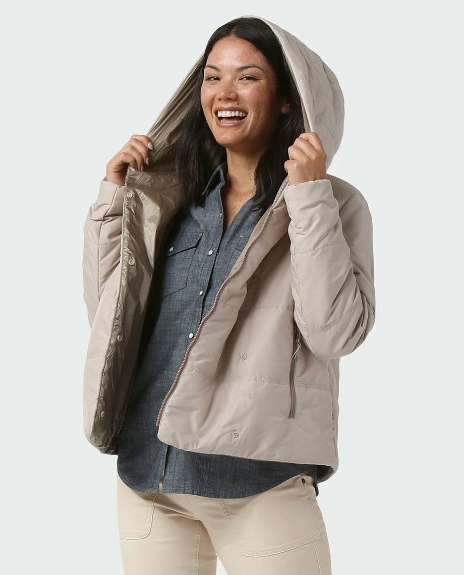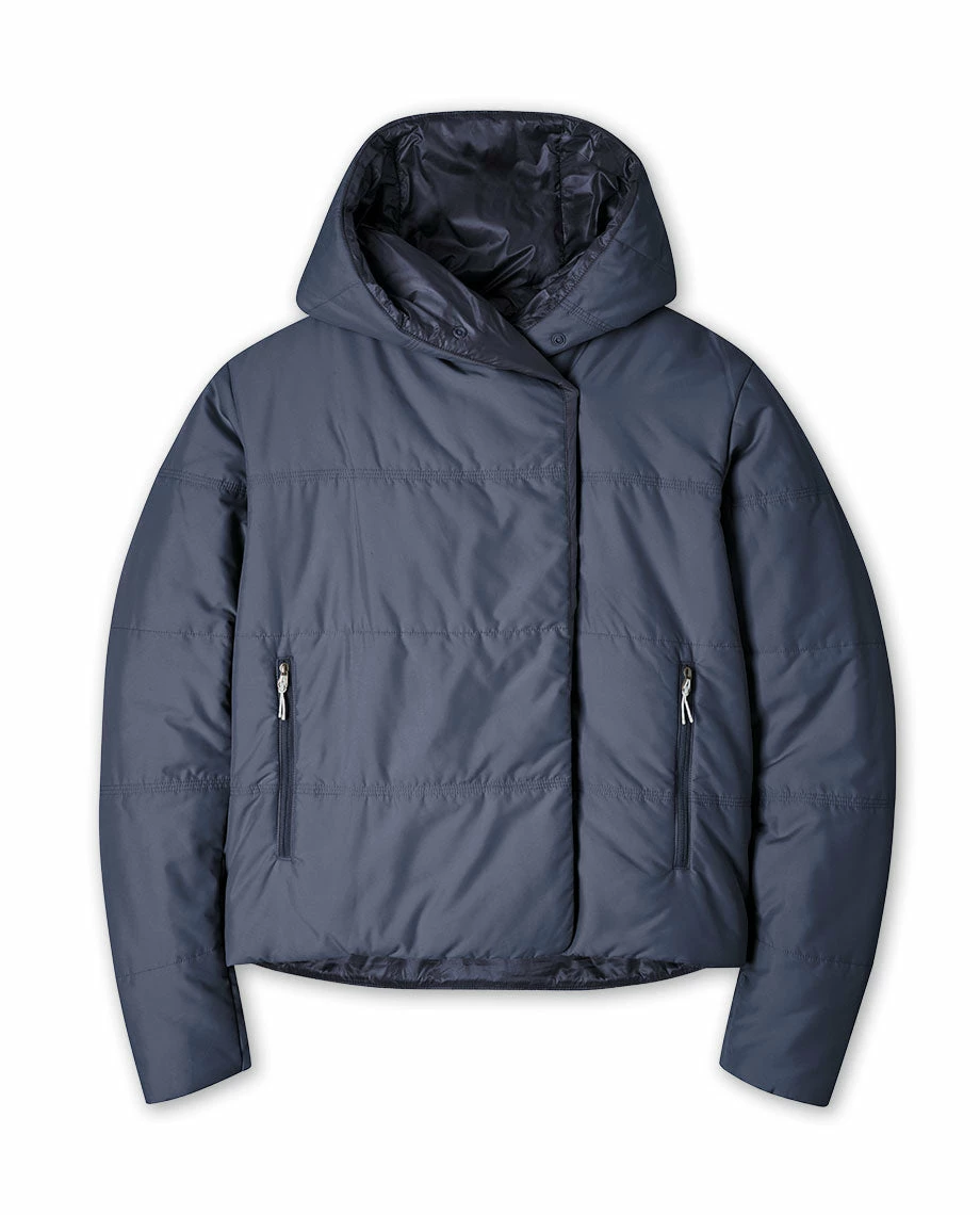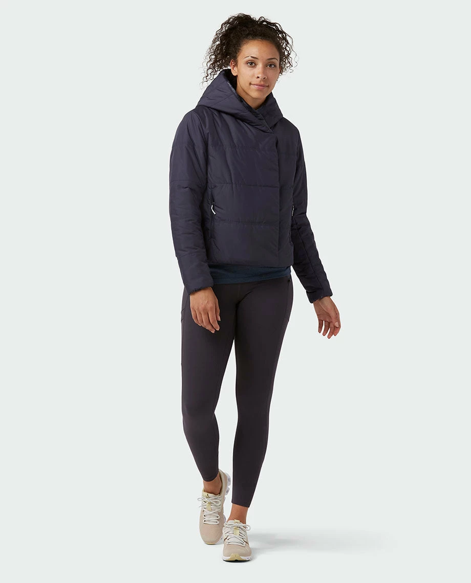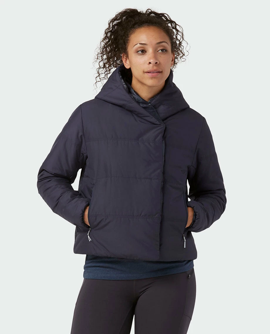 Where energetic style meets mountain chic, our new East Butte combines quilted insulation with intentional detailing. An aesthetic antidote to early fall frosts, the hooded jacket delivers an instant warming effect with PeakFillโข 50% recycled, synthetic insulation and expresses distinctive flair with an asymmetrical crossover placket and offset hidden zipper. An adjustable hem trims a straighter, mid-length fit and elevates any look, whether paired with pants, leggings or joggers.