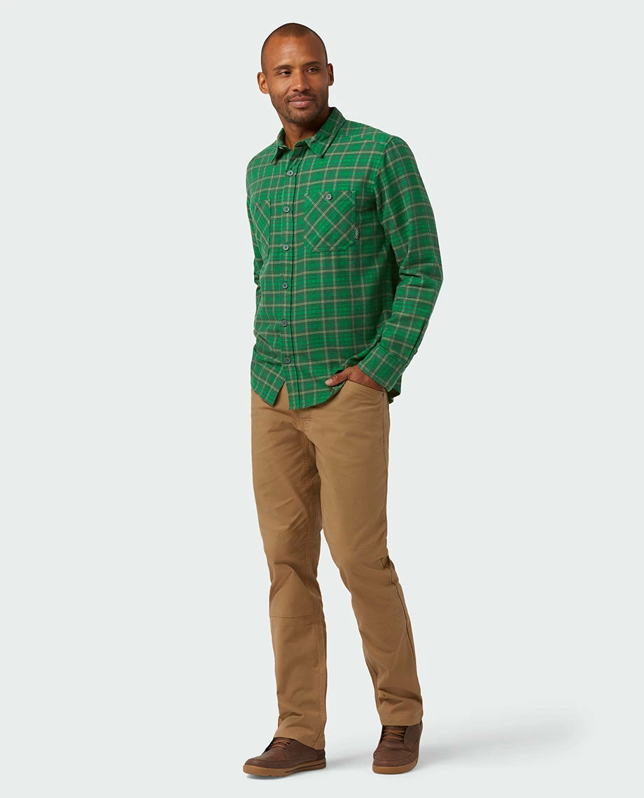 Even with a new organic fabric update, garage shops, woodsheds and dusty pickups remain the gritty domains of our mountain flannel. Updated with double-brushed organic cotton, this mountain icon features forward-facing shoulder seams for enhanced mobility and button-closure chest pockets for stowing key items. The 150-gram weight material adds lightweight seasonal warmth under a vest or a puffy, but won’t overheat when worn inside a heated shop or cabin. Plaid or solid options match up equally well with a framing hammer, a waxing iron or a tailgate six-pack.
