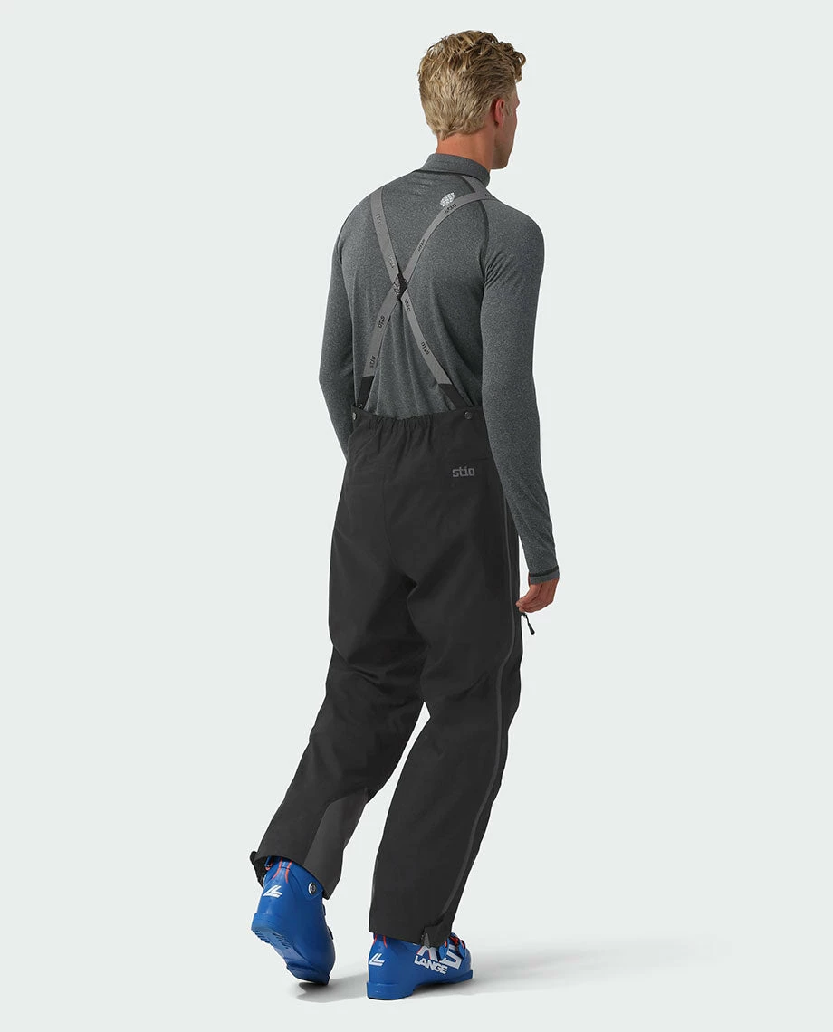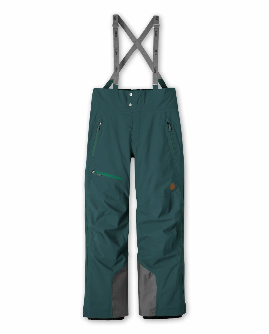 - High waisted mini-bib with fixed, adjustable, custom Stio® elastic suspender straps