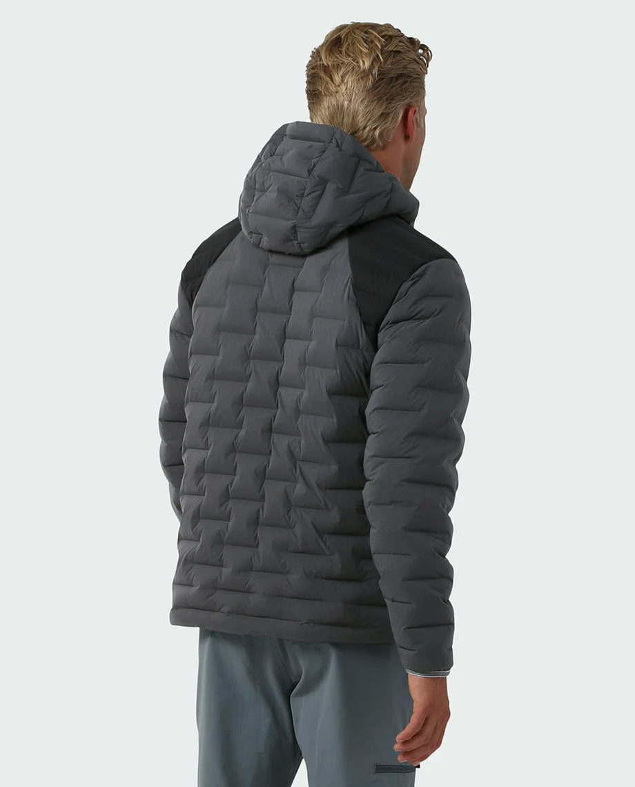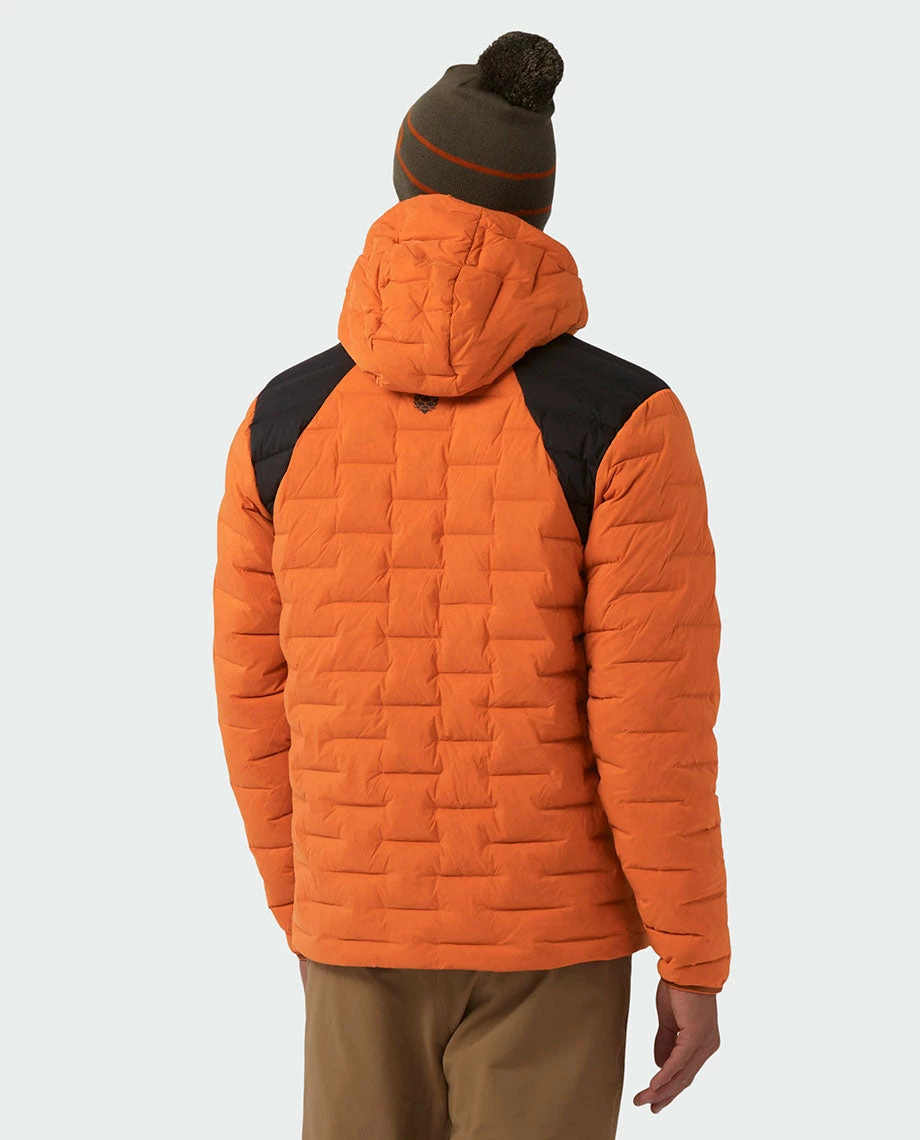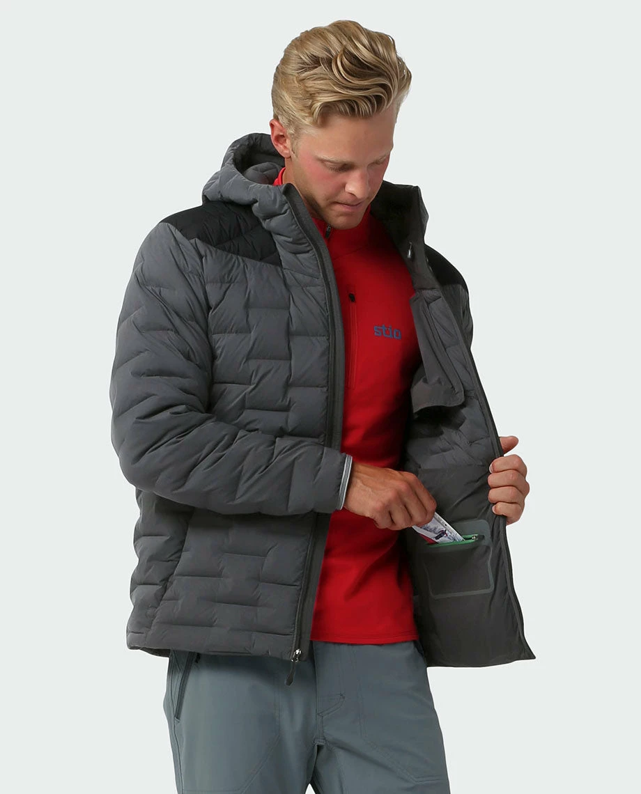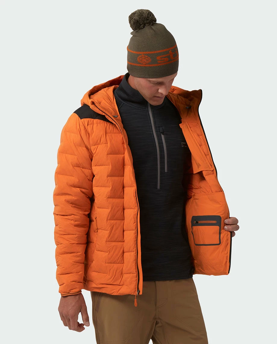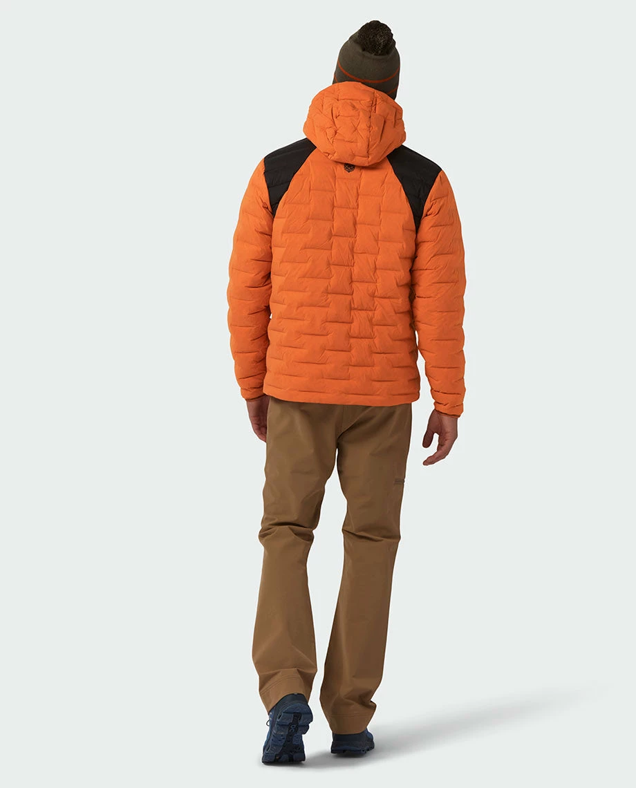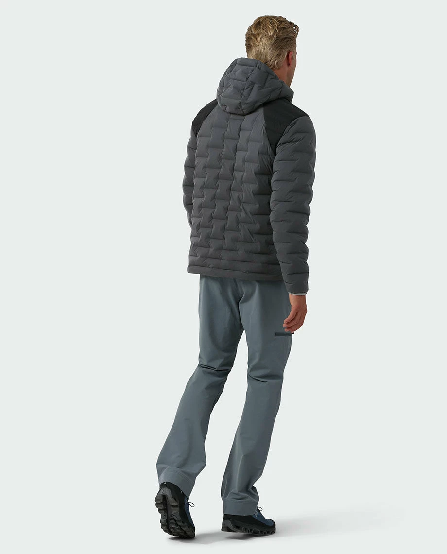 Freedom of movement was the guiding light in our approach to the classic belay parka. We achieved flex and stretch for active range with a combination of 20-denier doubleweave, four-way-stretch nylon and Stitchless™ dual tube construction, an innovation in insulation that maximizes loft and eliminates cold spots. Responsibly-sourced HyperDRY™ 650-fill goose down maximizes the heat-to-weight ratio yet still dries quickly when soaked in a mountain storm. The down-filled fixed hood provides an instant warm up on ridges or pitches while an internal security pocket keeps electronics warm, working and secure. An external DWR sheds snow and sleet.